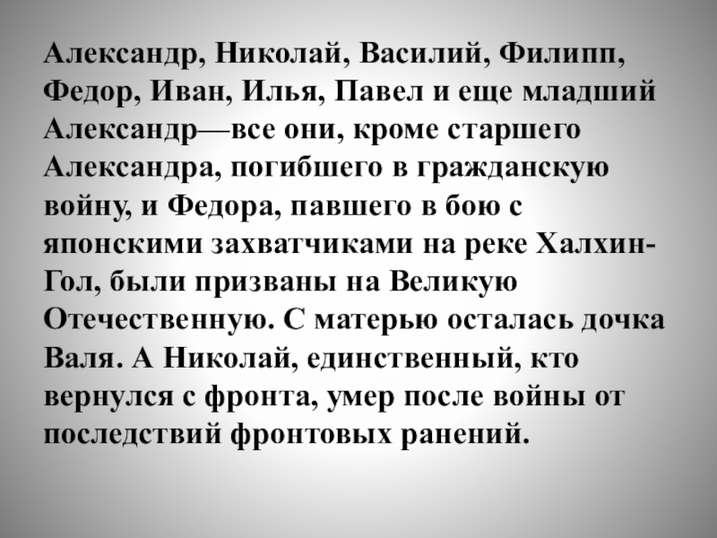 Александр—все они, кроме старшего Александра, погибшего в гражданскую войну, и Федора, павшего в бою с японскими захватчиками на реке Халхин-Гол, были призваны на Великую Отечественную. С матерью осталась дочка Валя. А Николай, единственный, кто вернулся с фронта, умер после войны от последствий фронтовых ранений.