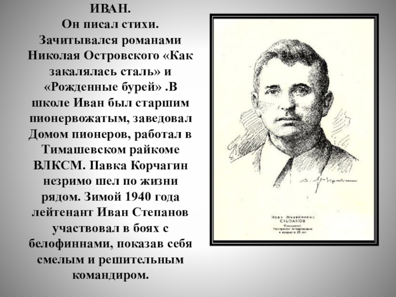 «Рожденные бурей» .В школе Иван был старшим пионервожатым, заведовал Домом пионеров, работал в Тимашевском райкоме ВЛКСМ. Павка Корчагин незримо шел по жизни рядом. Зимой 1940 года лейтенант Иван Степанов участвовал в боях с белофиннами, показав себя смелым и решительным командиром.