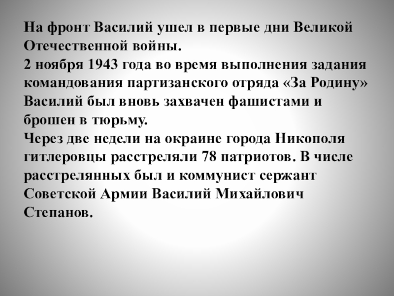 Через две недели на окраине города Никополя гитлеровцы расстреляли 78 патриотов. В числе расстрелянных был и коммунист сержант Советской Армии Василий Михайлович Степанов.