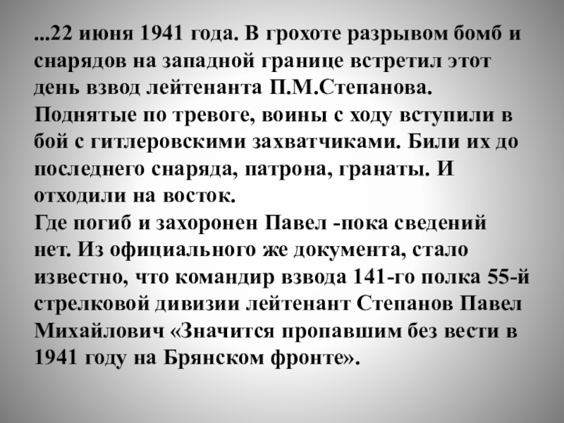 Где погиб и захоронен Павел -пока сведений нет. Из официального же документа, стало известно, что командир взвода 141-го полка 55-й стрелковой дивизии лейтенант Степанов Павел Михайлович «Значится пропавшим без вести в 1941 году на Брянском фронте».