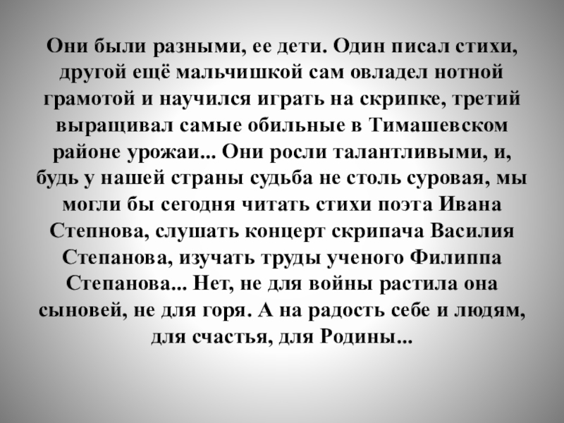 сам овладел нотной грамотой и научился играть на скрипке, третий выращивал самые обильные в Тимашевском районе урожаи... Они росли талантливыми, и, будь у нашей страны судьба не столь суровая, мы могли бы сегодня читать стихи поэта Ивана Степнова, слушать концерт скрипача Василия Степанова, изучать труды ученого Филиппа Степанова... Нет, не для войны растила она сыновей, не для горя. А на радость себе и людям, для счастья, для Родины...