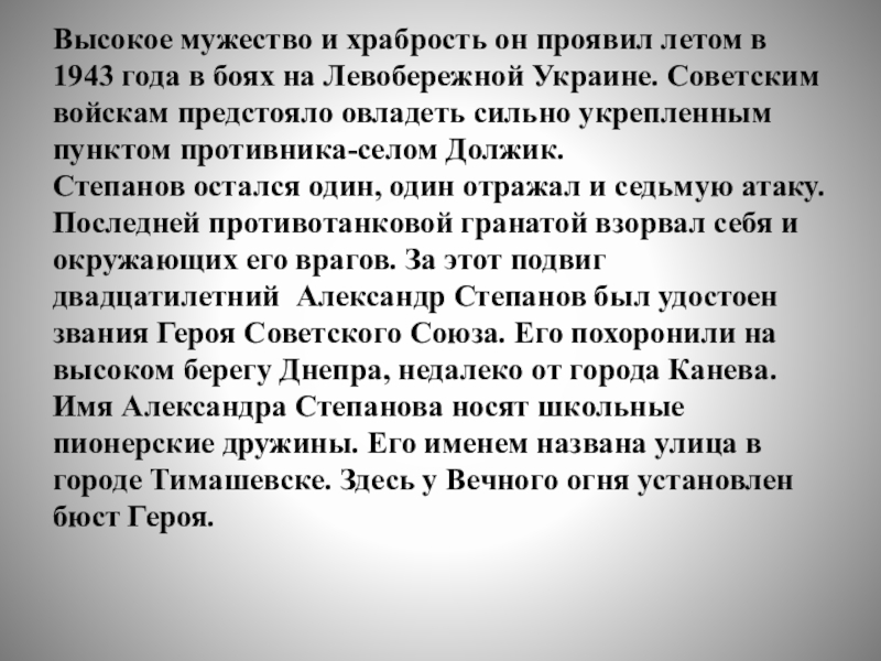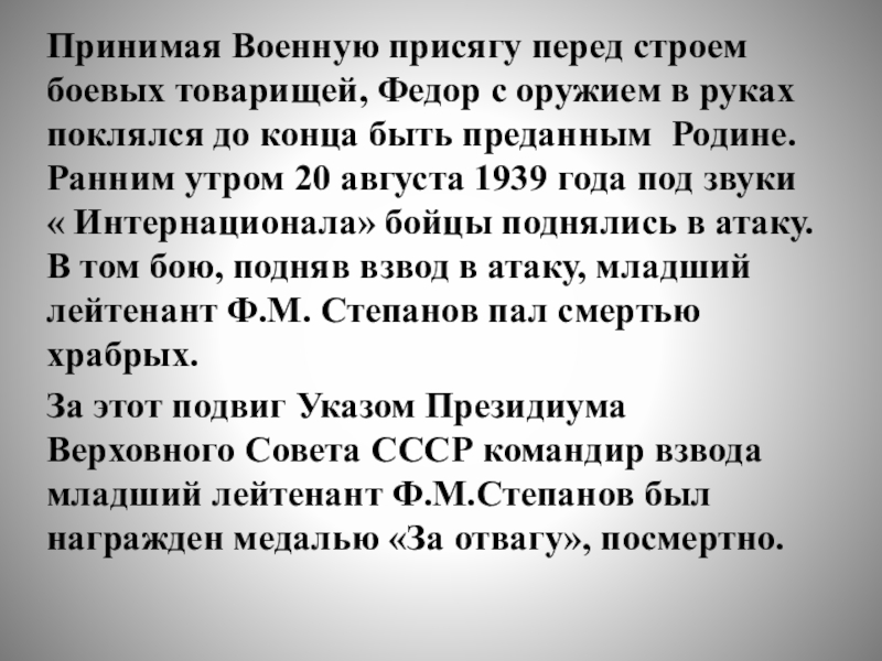 руках поклялся до конца быть преданным Родине. Ранним утром 20 августа 1939 года под звуки « Интернационала» бойцы поднялись в атаку. В том бою, подняв взвод в атаку, младший лейтенант Ф.М. Степанов пал смертью храбрых.