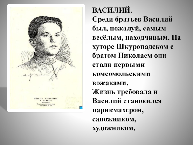 Среди братьев Василий был, пожалуй, самым весёлым, находчивым. На хуторе Шкуропадском