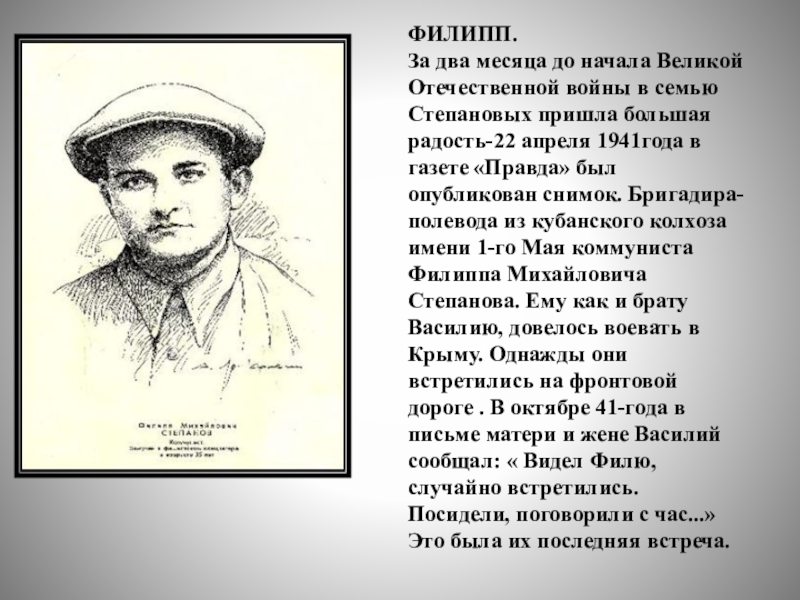 пришла большая радость-22 апреля 1941года в газете «Правда» был опубликован снимок. Бригадира-полевода из кубанского колхоза имени 1-го Мая коммуниста Филиппа Михайловича Степанова. Ему как и брату Василию, довелось воевать в Крыму. Однажды они встретились на фронтовой дороге . В октябре 41-года в письме матери и жене Василий сообщал: « Видел Филю, случайно встретились. Посидели, поговорили с час...» Это была их последняя встреча.