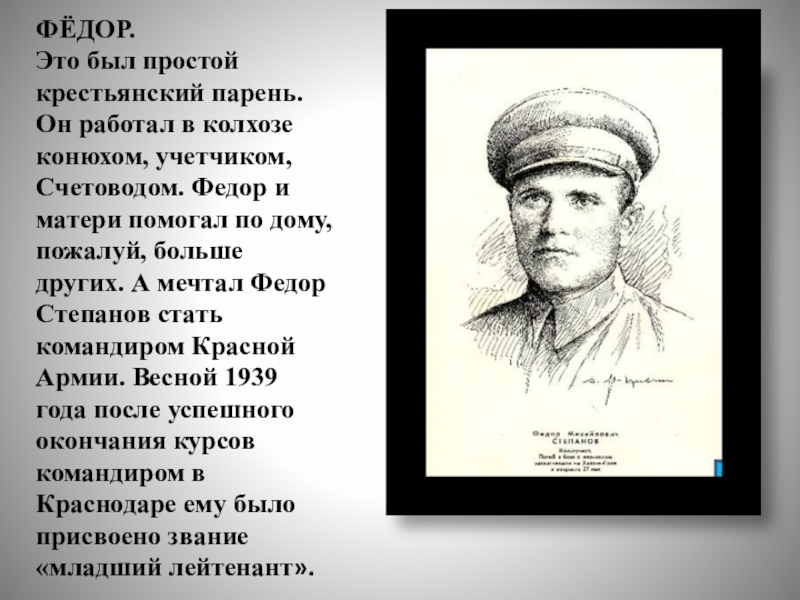 Счетоводом. Федор и матери помогал по дому, пожалуй, больше других. А мечтал Федор Степанов стать командиром Красной Армии. Весной 1939 года после успешного окончания курсов командиром в Краснодаре ему было присвоено звание «младший лейтенант».