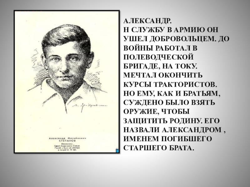 полеводческой бригаде, на току. Мечтал окончить курсы трактористов. Но ему, как и братьям, суждено было взять оружие, чтобы защитить Родину. Его назвали Александром ,именем погибшего старшего брата.