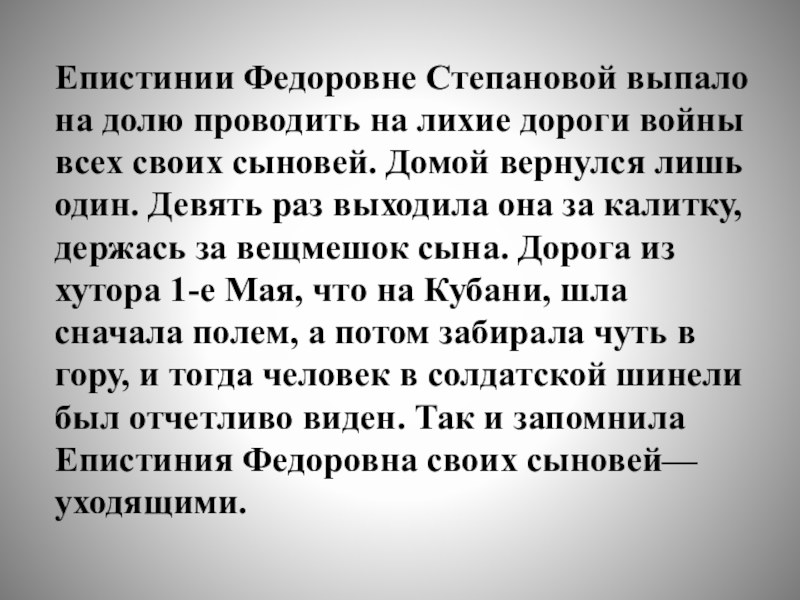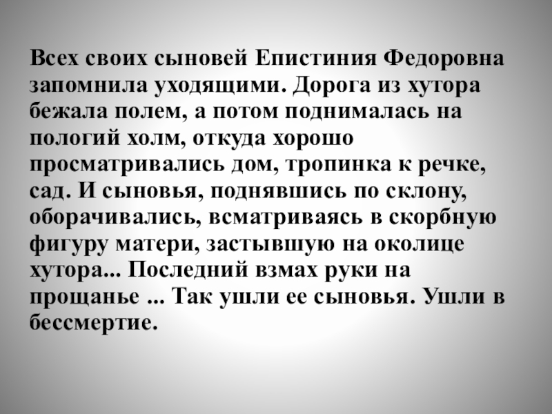 Слайд 26Всех своих сыновей Епистиния Федоровна запомнила уходящими. Дорога из хутора бежала