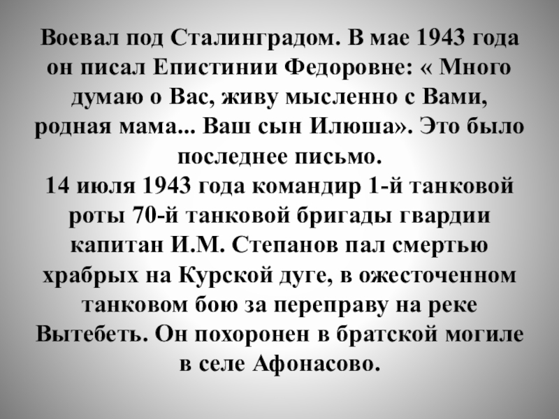 Слайд 21Воевал под Сталинградом. В мае 1943 года он писал Епистинии Федоровне: