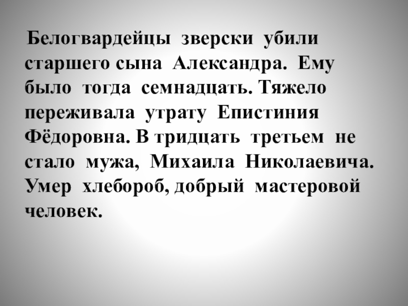 Слайд 7 Белогвардейцы зверски убили старшего сына Александра. Ему было тогда семнадцать.