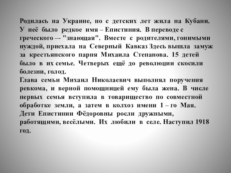 неё было редкое имя – Епистиния. В переводе с греческого –- "знающая". Вместе с родителями, гонимыми нуждой, приехала на Северный Кавказ Здесь вышла замуж за крестьянского парня Михаила Степанова. 15 детей было в их семье. Четверых ещё до революции скосили болезни, голод.
