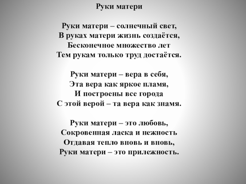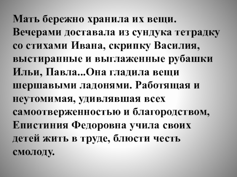 стихами Ивана, скрипку Василия, выстиранные и выглаженные рубашки Ильи, Павла...Она гладила вещи шершавыми ладонями. Работящая и неутомимая, удивлявшая всех самоотверженностью и благородством, Епистиния Федоровна учила своих детей жить в труде, блюсти честь смолоду.