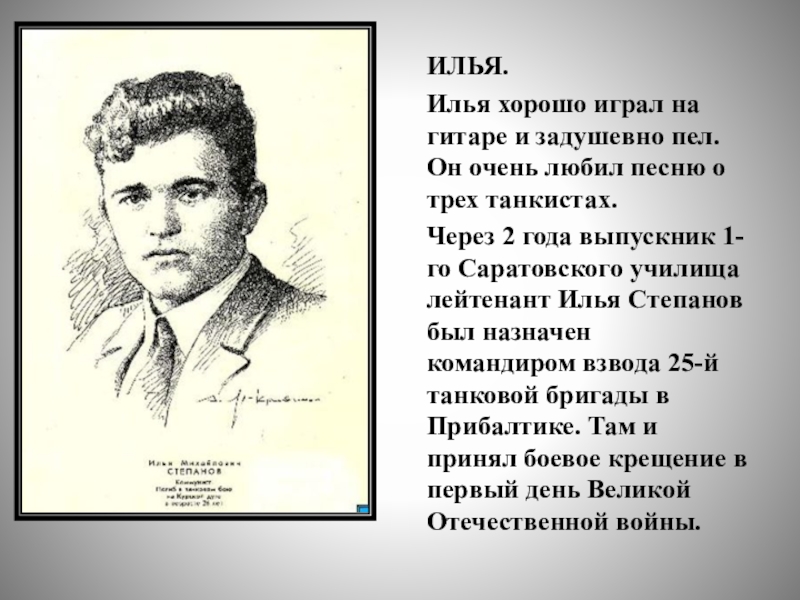 Через 2 года выпускник 1-го Саратовского училища лейтенант Илья Степанов был назначен командиром взвода 25-й танковой бригады в Прибалтике. Там и принял боевое крещение в первый день Великой Отечественной войны.