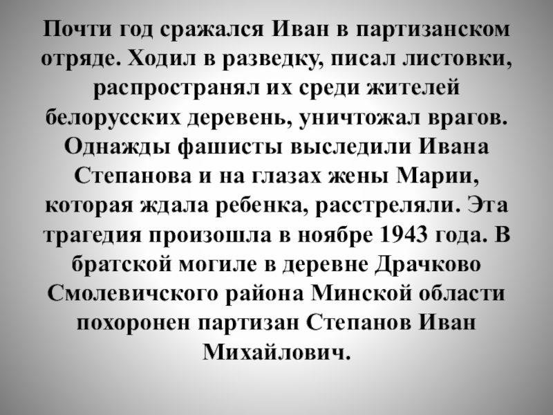 листовки, распространял их среди жителей белорусских деревень, уничтожал врагов. Однажды фашисты выследили Ивана Степанова и на глазах жены Марии, которая ждала ребенка, расстреляли. Эта трагедия произошла в ноябре 1943 года. В братской могиле в деревне Драчково Смолевичского района Минской области похоронен партизан Степанов Иван Михайлович.