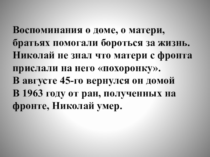 Слайд 11Воспоминания о доме, о матери, братьях помогали бороться за жизнь. Николай