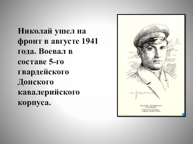 Слайд 10Николай ушел на фронт в августе 1941 года. Воевал в составе