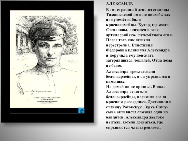 Но домой он не пришел. В поле Александра схватили белогвардейцы, посчитав его за красного разведчика. Доставили в станицу Роговскую. Здесь Сашу-сына активиста опознал один из бандитов. Александра жестоко пытали, хотели дознаться, где скрываются члены ревкома.