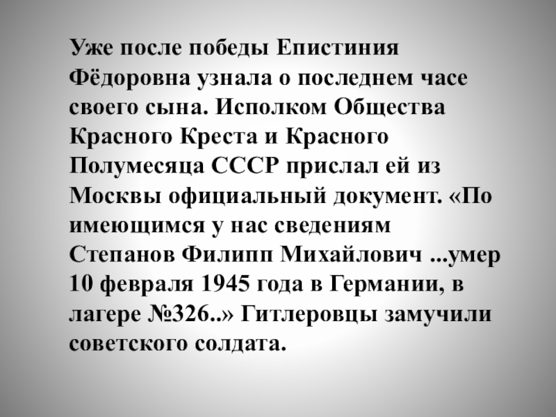 Исполком Общества Красного Креста и Красного Полумесяца СССР прислал ей из Москвы официальный документ. «По имеющимся у нас сведениям Степанов Филипп Михайлович ...умер 10 февраля 1945 года в Германии, в лагере №326..» Гитлеровцы замучили советского солдата.