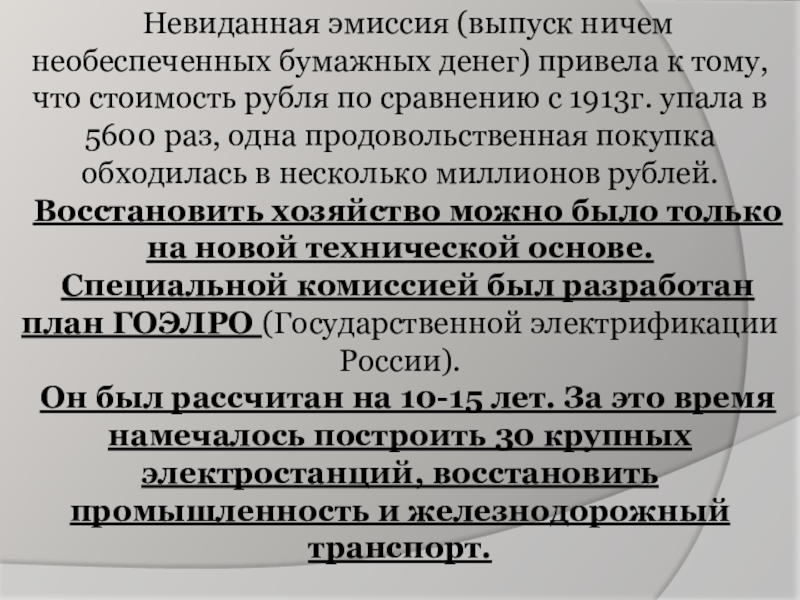 Он был рассчитан на 10-15 лет. За это время намечалось построить 30 крупных электростанций, восстановить промышленность и железнодорожный транспорт.