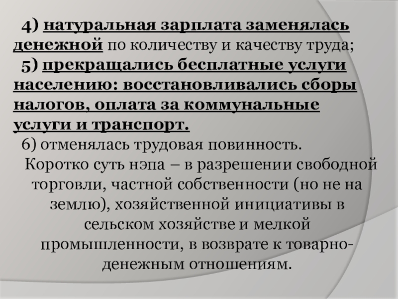 Коротко суть нэпа – в разрешении свободной торговли, частной собственности (но не на землю), хозяйственной инициативы в сельском хозяйстве и мелкой промышленности, в возврате к товарно-денежным отношениям.