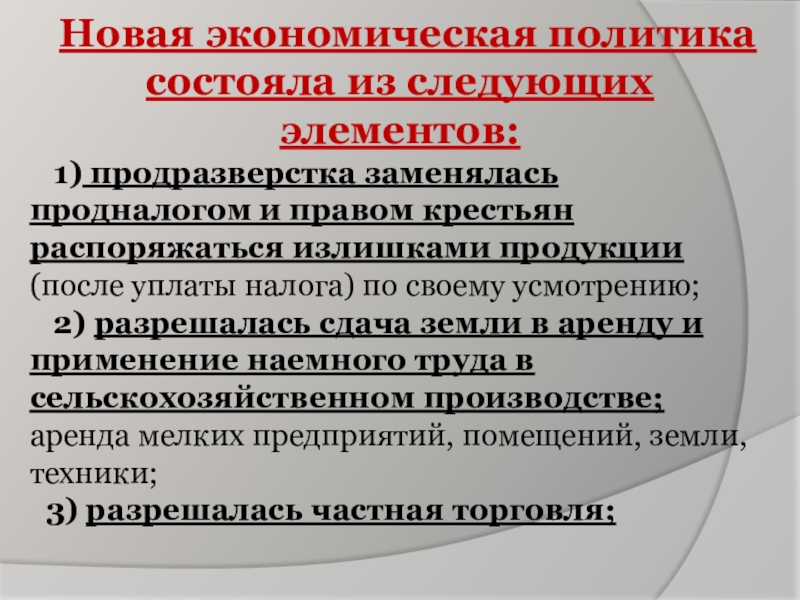 Слайд 21Новая экономическая политика состояла из следующих элементов: