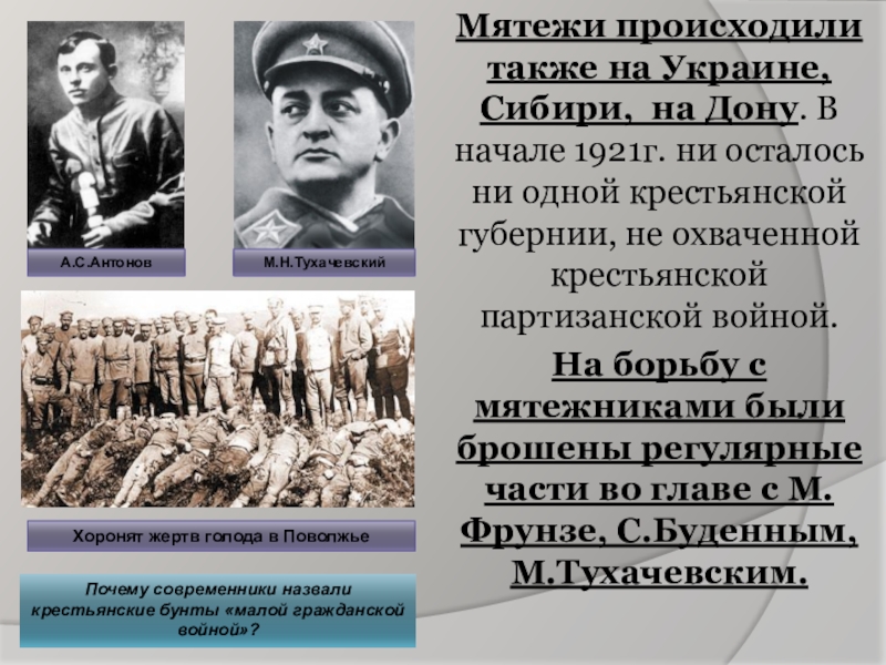 На борьбу с мятежниками были брошены регулярные части во главе с М.Фрунзе, С.Буденным, М.Тухачевским.
