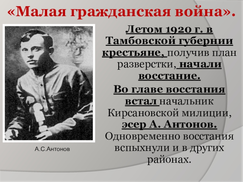 Во главе восстания встал начальник Кирсановской милиции, эсер А. Антонов. Одновременно восстания вспыхнули и в других районах.