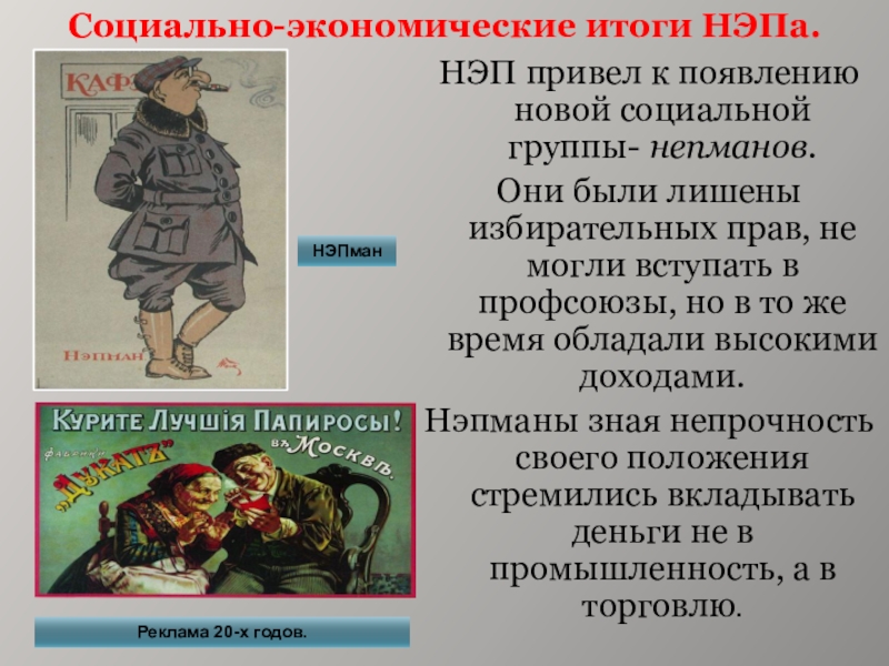 Нэпманы зная непрочность своего положения стремились вкладывать деньги не в промышленность, а в торговлю.