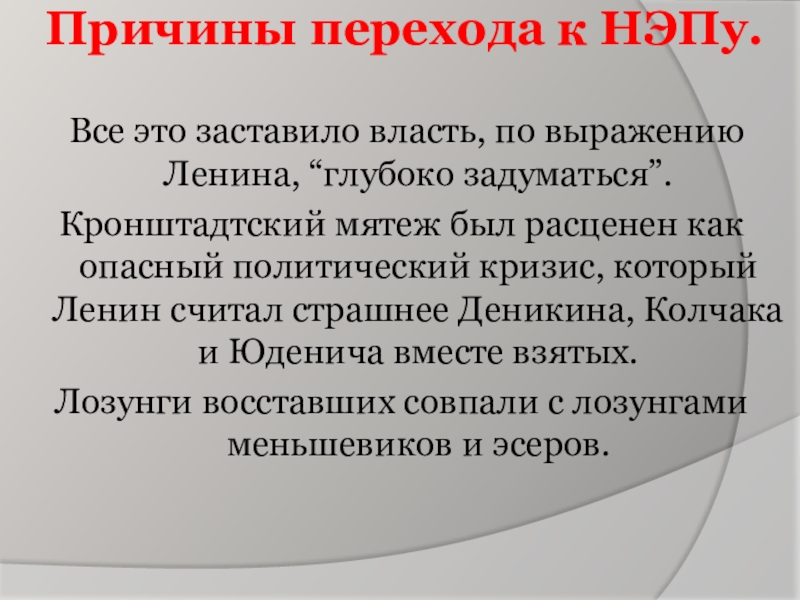 Кронштадтский мятеж был расценен как опасный политический кризис, который Ленин считал страшнее Деникина, Колчака и Юденича вместе взятых.