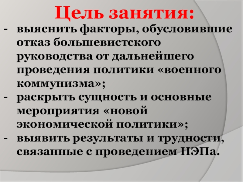 выяснить факторы, обусловившие отказ большевистского руководства от дальнейшего проведения политики
