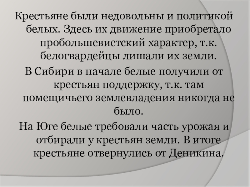 Слайд 9Крестьяне были недовольны и политикой белых. Здесь их движение приобретало пробольшевистский