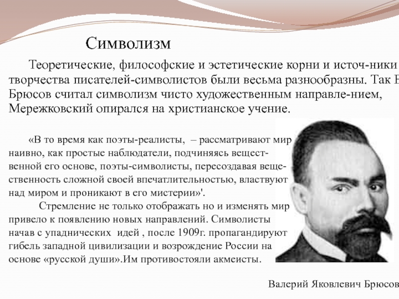«В то время как поэты-реалисты, – рассматривают мир наивно, как простые наблюдатели, подчиняясь вещест-венной его основе, поэты-символисты, пересоздавая веще-ственность сложной своей впечатлительностью, властвуют над миром и проникают в его мистерии»'.