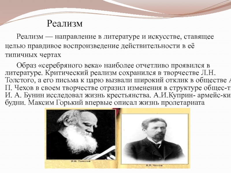 Реализм — направление в литературе и искусстве, ставящее целью правдивое воспроизведение действительности в её типичных чертах