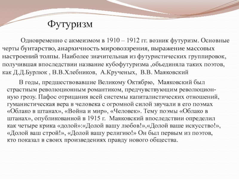 В годы, предшествовавшие Великому Октябрю, Маяковский был страстным революционным романтиком, предчувствующим революцион-ную грозу. Пафос отрицания всей системы капиталистических отношений, гуманистическая вера в человека с огромной силой звучали в его поэмах «Облако в штанах», «Война и мир», «Человек». Тему поэмы «Облако в штанах», опубликованной в 1915 г. Маяковский впоследствии определил как четыре крика «долой»:«Долой вашу любов!»,«Долой ваше искусство!», «Долой ваш строй!», «Долой вашу религию!» Он был первым из поэтов, кто показал в своих произведениях правду нового общества.
