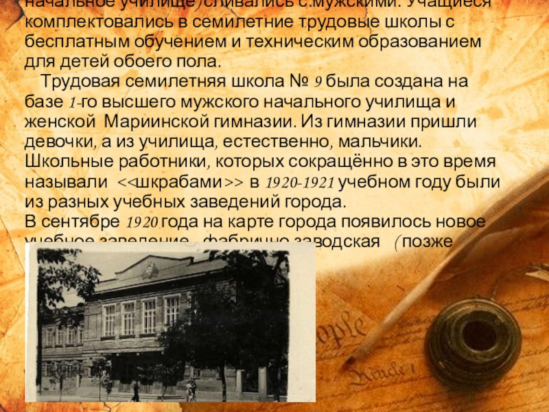 Трудовая семилетняя школа № 9 была создана на базе 1-го высшего мужского начального училища и женской Мариинской гимназии. Из гимназии пришли девочки, а из училища, естественно, мальчики. Школьные работники, которых сокращённо в это время называли <<шкрабами>> в 1920-1921 учебном году были из разных учебных заведений города.