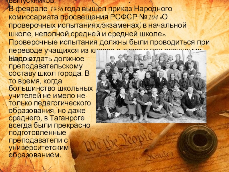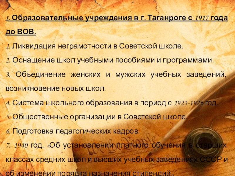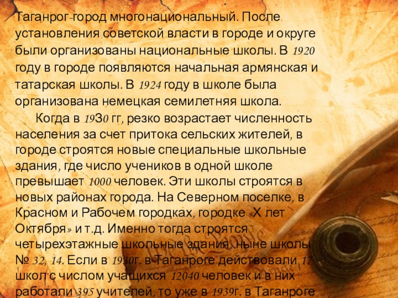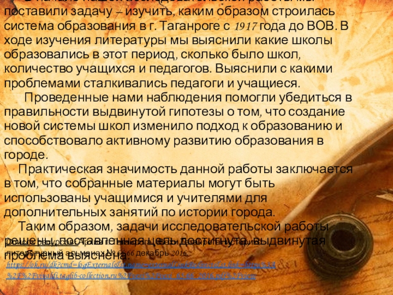 задачу – изучить, каким образом строилась система образования в г. Таганроге с 1917 года до ВОВ. В ходе изучения литературы мы выяснили какие школы образовались в этот период, сколько было школ, количество учащихся и педагогов. Выяснили с какими проблемами сталкивались педагоги и учащиеся.