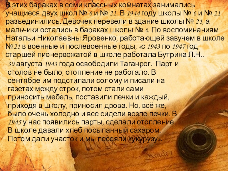 30 августа 1943 года освободили Таганрог. Парт и столов не было, отопление не работало. В сентябре им подстилали солому и писали на газетах между строк, потом стали сами приносить мебель, поставили печки и каждый, приходя в школу, приносил дрова. Но, всё же, было очень холодно и все сидели возле печки. В 1945 у нас появились парты, сделали отопление. В школе давали хлеб посыпанный сахаром. Потом дали участок и мы посеяли кукурузу».
