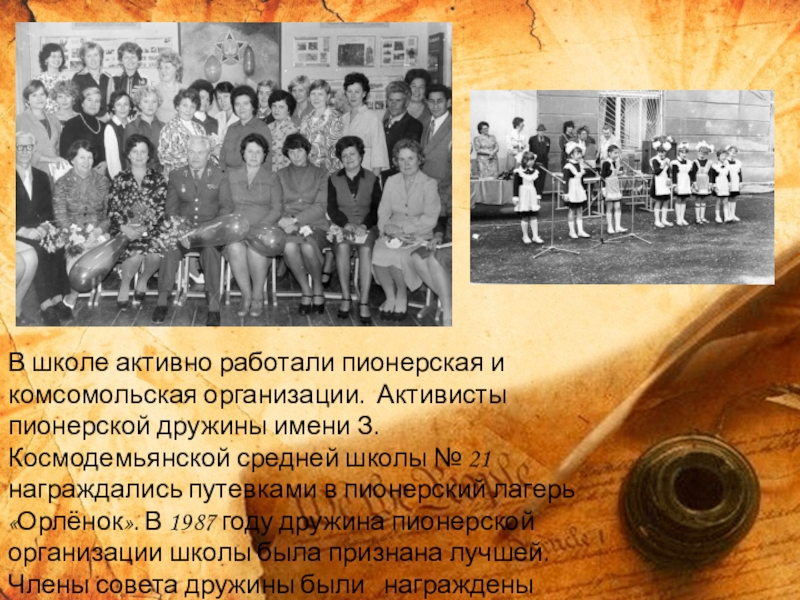 В школе активно работали пионерская и комсомольская организации. Активисты пионерской дружины