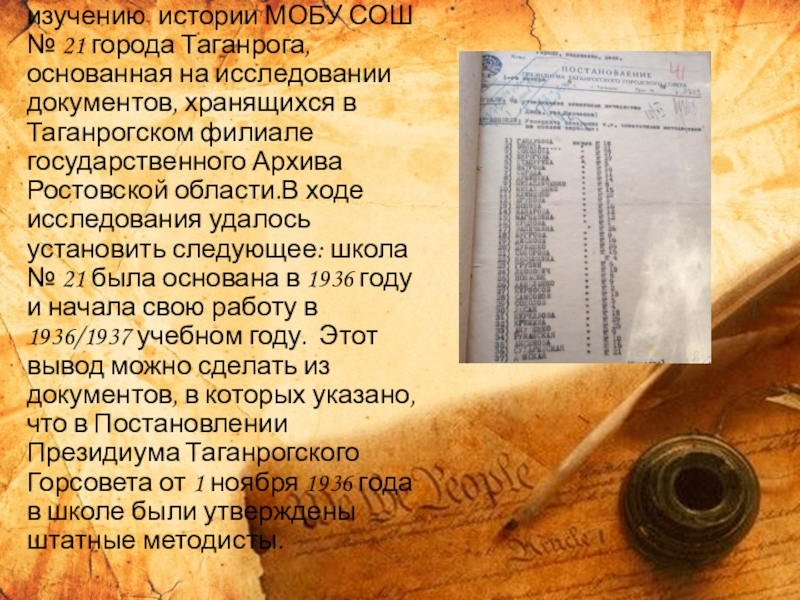Таганрога, основанная на исследовании документов, хранящихся в Таганрогском филиале государственного Архива Ростовской области.В ходе исследования удалось установить следующее: школа № 21 была основана в 1936 году и начала свою работу в 1936/1937 учебном году. Этот вывод можно сделать из документов, в которых указано, что в Постановлении Президиума Таганрогского Горсовета от 1 ноября 1936 года в школе были утверждены штатные методисты.