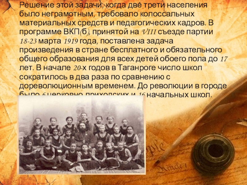 колоссальных материальных средств и педагогических кадров. В программе ВКП(б), принятой на VIII съезде партии 18-23 марта 1919 года, поставлена задача произведения в стране бесплатного и обязательного общего образования для всех детей обоего пола до 17 лет. В начале 20-х годов в Таганроге число школ сократилось в два раза по сравнению с дореволюционным временем. До революции в городе было 6 церковно-приходских и 16 начальных школ.