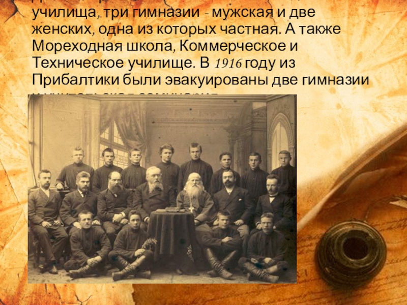 женских, одна из которых частная. А также Мореходная школа, Коммерческое и Техническое училище. В 1916 году из Прибалтики были эвакуированы две гимназии и учительская семинария.