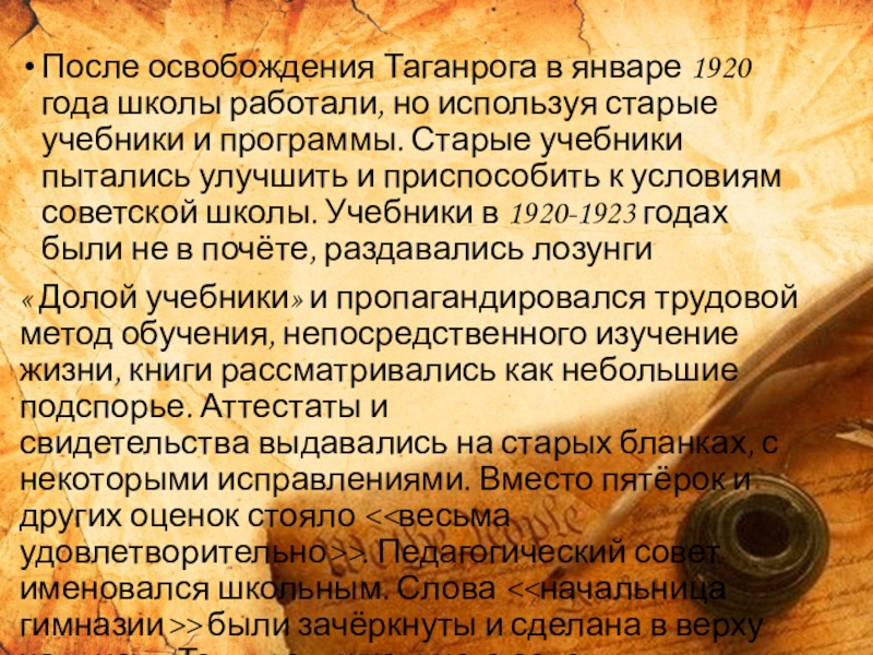 Слайд 11После освобождения Таганрога в январе 1920 года школы работали, но используя