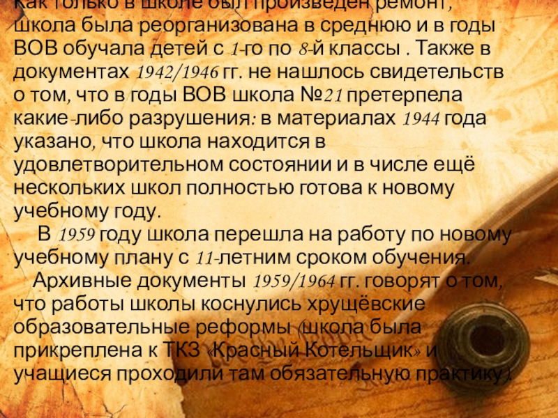 среднюю и в годы ВОВ обучала детей с 1-го по 8-й классы . Также в документах 1942/1946 гг. не нашлось свидетельств о том, что в годы ВОВ школа №21 претерпела какие-либо разрушения: в материалах 1944 года указано, что школа находится в удовлетворительном состоянии и в числе ещё нескольких школ полностью готова к новому учебному году.