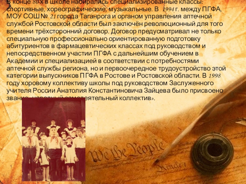 музыкальные. В 1994 г. между ПГФА, МОУ СОШ № 21 города Таганрога и органом управления аптечной службой Ростовской области был заключён революционный для того времени трёхсторонний договор. Договор предусматривал не только специальную профессионально ориентированную подготовку абитуриентов в фармацевтических классах под руководством и непосредственном участии ПГФА с дальнейшим обучением в Академии и специализацией в соответствии с потребностями аптечной службы региона, но и первоочередное трудоустройство этой категории выпускников ПГФА в Ростове и Ростовской области. В 1998 году хоровому коллективу школы под руководством Заслуженного учителя России Анатолия Константиновича Зайцева было присвоено звание «народный самодеятельный коллектив».