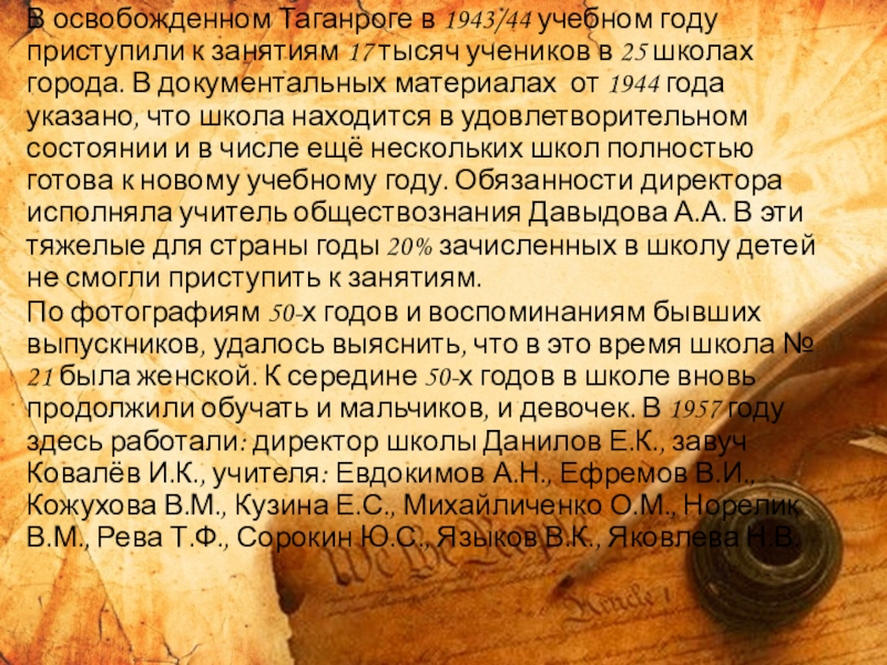 учеников в 25 школах города. В документальных материалах от 1944 года указано, что школа находится в удовлетворительном состоянии и в числе ещё нескольких школ полностью готова к новому учебному году. Обязанности директора исполняла учитель обществознания Давыдова А.А. В эти тяжелые для страны годы 20% зачисленных в школу детей не смогли приступить к занятиям.