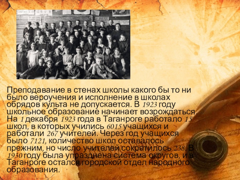 исполнение в школах обрядов культа не допускается. В 1923 году школьное образование начинает возрождаться. На 1 декабря 1923 года в Таганроге работало 15 школ, в которых учились 6015 учащихся и работали 267 учителей. Через год учащихся было 7121, количество школ оставалось прежним, но число учителей сократилось 238. В 1930 году была упразднена система округов, и в Таганроге остался городской отдел народного образования.
