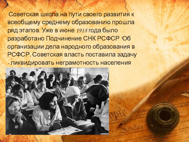 образованию прошла ряд этапов. Уже в июне 1918 года было разработано Подчинение СНК РСФСР "Об организации дела народного образования в РСФСР. Советская власть поставила задачу - ликвидировать неграмотность населения всех возрастов, а не только детей.
