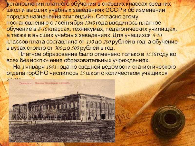 в старших классах средних школ и высших учебных заведениях СССР и об изменении порядка назначения стипендий». Согласно этому постановлению с 1 сентября 1940 года вводилось платное обучение в 8-10 классах, техникумах, педагогических училищах, а также в высших учебных заведениях. Для учащихся 8-10 классов плата составляла от 150 до 200 рублей в год, а обучение в вузах стоило от 300 до 500 рублей в год.