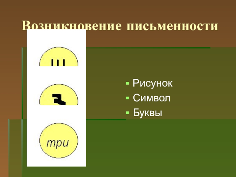 Рисуночное письмоНадпись на надгробии индейского вождя:«Вождь по имени Олень пережил семь походов, девять сражений, и во время