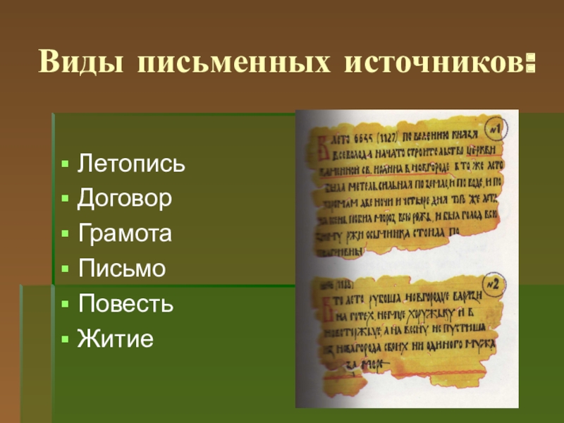 Виды письменных источников:ЛетописьДоговор Грамота Письмо Повесть Житие