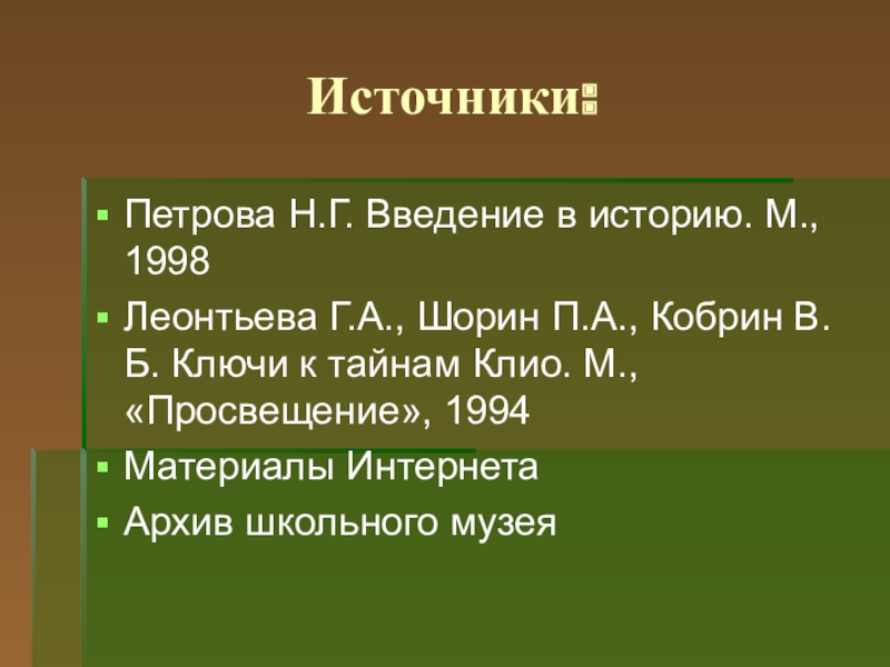 Источники:Петрова Н.Г. Введение в историю. М., 1998Леонтьева Г.А., Шорин П.А., Кобрин В.Б. Ключи к тайнам Клио. М.,